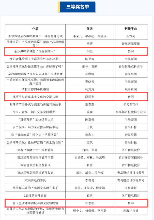 鲁网9月30日讯(记者 薛同春)近日,由青岛国际啤酒节西海岸新区组委会办公室与青岛西海岸啤酒文化集团有限公司联合主办的“金沙滩啤酒城杯”优秀宣传作品评选落下帷幕,获奖名单正式对外公布。作为山东本土极具权威性的省级新闻网站,鲁网凭借深厚的新闻采编底蕴与前沿的内容创作思维,在众多参评作品中崭露头角——提报的4件作品成功斩获奖项,其中1件获二等奖、3件获三等奖。这一成绩不仅是对鲁网内容质量的高度认可,更凸显了省级主流媒体在区域文化传播、节会品牌建设中的核心赋能价值。