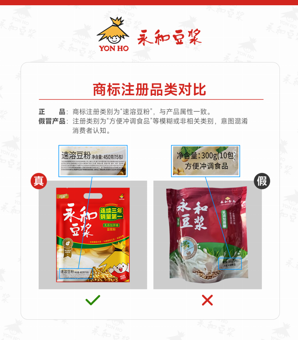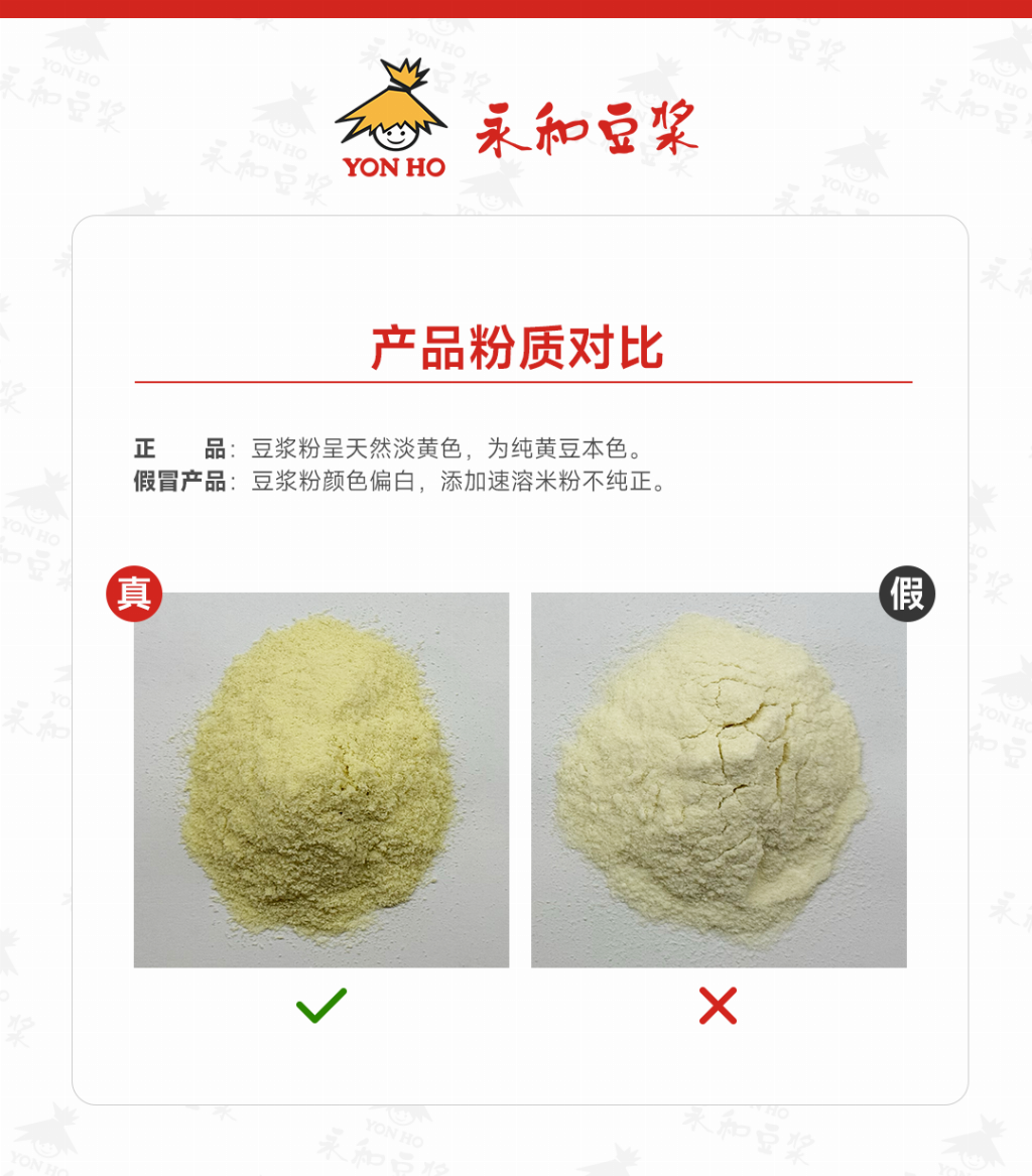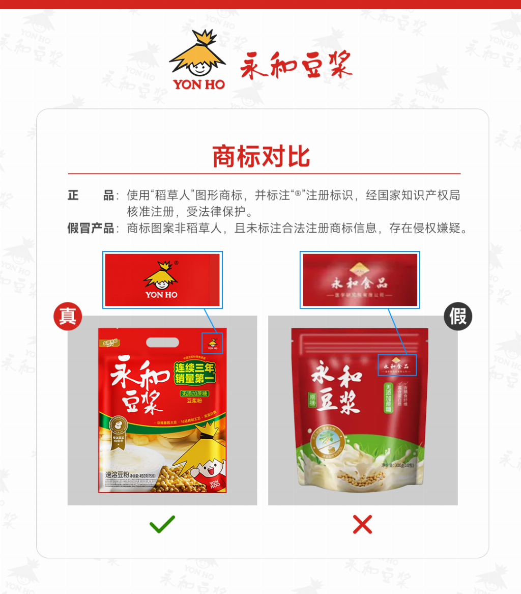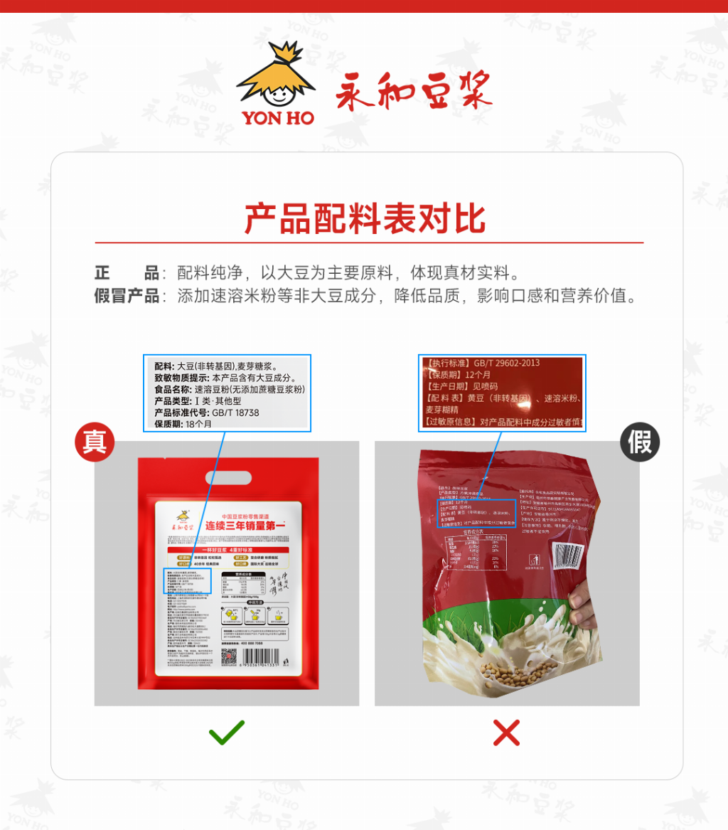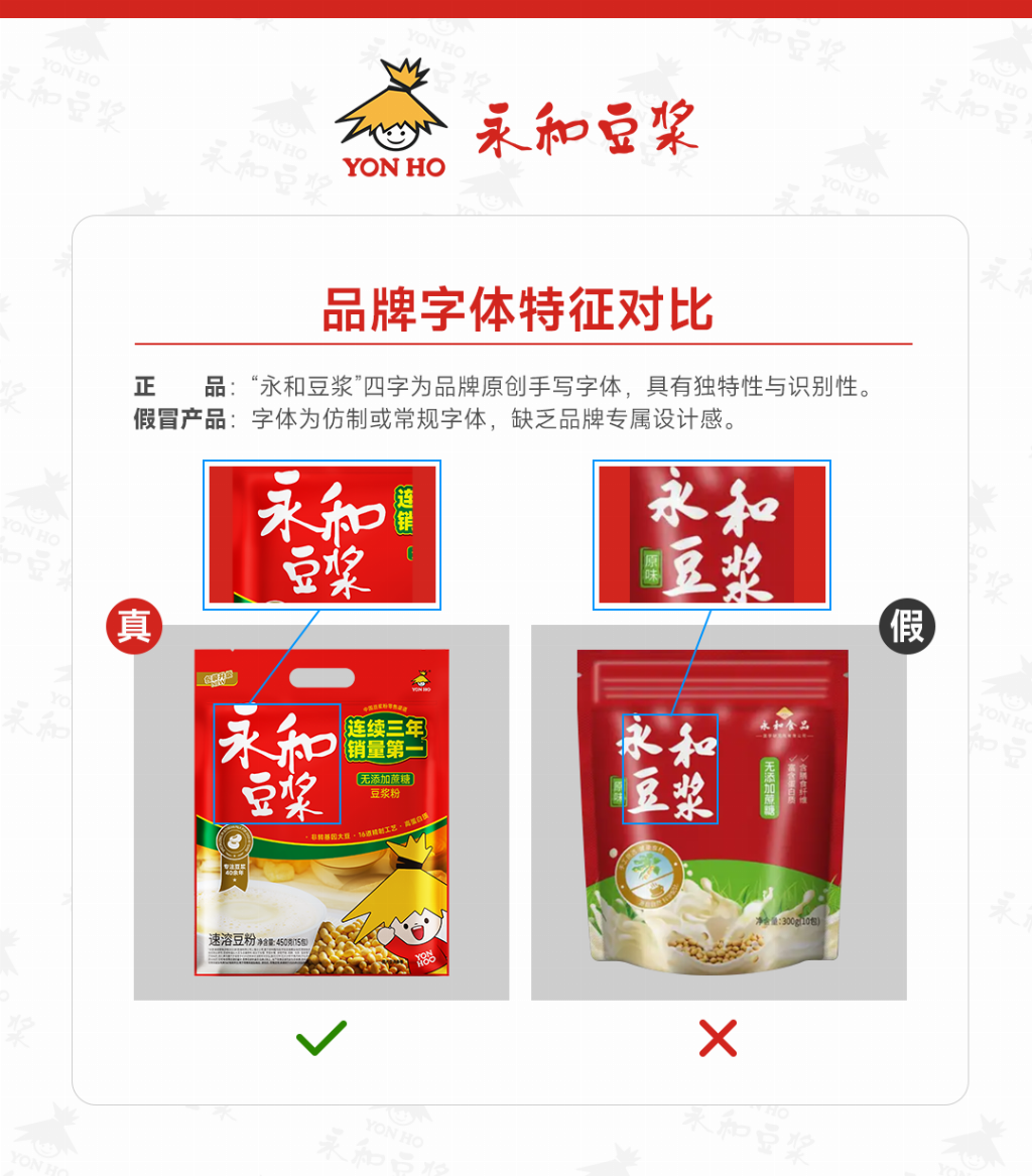 为帮助消费者清晰辨识,现将“永和豆浆”正品与市场假冒伪劣产品的主要区别,以正品永和豆浆无添加庶糖豆浆粉450克为例。请广大消费者在购买时认准以上正品特征,选择正规渠道,谨防假冒,保障自身权益与健康。对比如下: