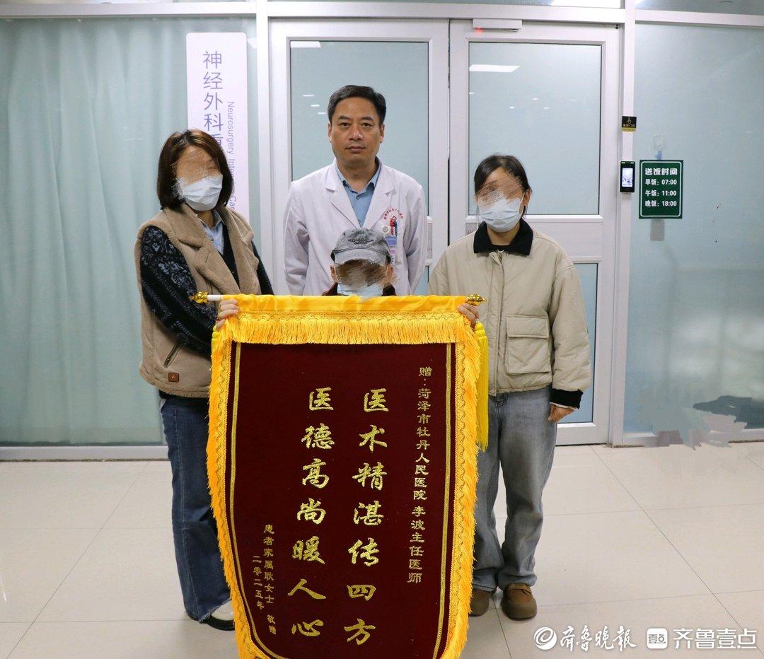 待患者身体条件符合手术要求后,将液氮中保存的骨瓣取出复温、精准拼装,成功植入患者颅内。术后恢复期间,患者未出现任何并发症,头部外形恢复自然,达到“完美”的手术效果,“现在根本看不出来做过手术,真的太感谢李主任了!”出院时,患者紧紧握着李波的手,激动之情溢于言表。家属也特意制作了写有“医术精湛传四方,医德高尚暖人心”的锦旗,以表达他们深深的感激。