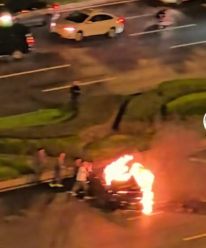 大皖新闻讯 10月13日凌晨,四川成都一条道路上一辆轿车起火。有网民发布的视频中,多位路过车辆的司机下车上前砸窗、拉门,疑似要将车内的人救出来,但并未成功。视频里,有消防人员赶到现场灭火,火势最终被扑灭,但车辆损毁严重。有网民称,涉事车辆是某著名品牌。