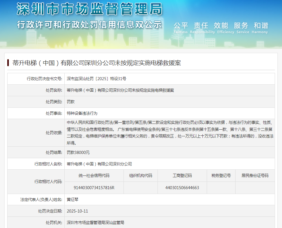 齐鲁晚报·齐鲁壹点记者于深圳市市场监督管理局行政处罚公示栏获悉,10月11日,蒂升电梯(中国)有限公司深圳分公司(下称“蒂升电梯深圳分公司”)收行政处罚决定书,其处罚事由是“特种设备违法行为”。行政处罚决定书文号:深市监深汕处罚〔2025〕特设31号。