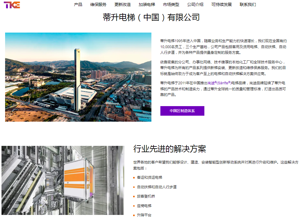 蒂升电梯官网介绍,蒂升电梯1995年进入中国,随着业务和生产能力的快速增长,其在全国有约10,000名员工,三个生产基地,公司产品包括客用及货用电梯、自动扶梯、自动人行步道,并为各种产品提供量身定制的服务方案。依靠密集的分公司、办事处网络、技术雄厚的本地化工厂和全球技术服务中心,蒂升电梯为所有的产品系列提供新梯安装、更新改造和维修保养服务。