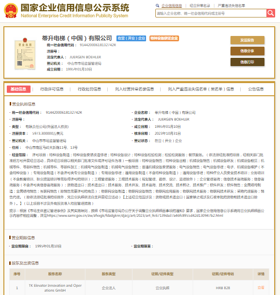国家企业信用信息公示系统显示,蒂升电梯(中国)有限公司深圳分公司成立于2001年,负责人黄征琴。其母公司——蒂升电梯(中国)有限公司成立于1995年,注册资本5973.3万美元,法定代表人JUERGEN BOEHLER。