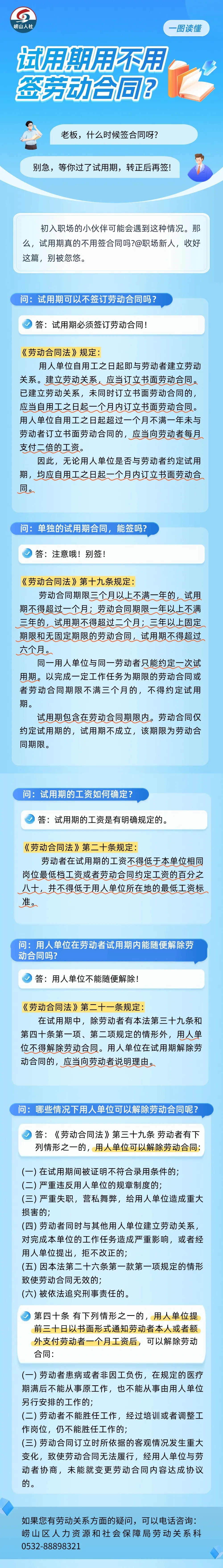 鲁网10月13日讯青岛市崂山区人力资源和社会保障局推出“周周讲”与“月月答”栏目,围绕就业创业、社会保障、人事人才、劳动关系类各项政策法规,以“权威解读、精准服务、互动交流”为宗旨,聚焦群众和企业关切的人社热点、难点问题,采用通俗易懂的宣传形式为大家解疑释惑。本期解读:试用期用不用签劳动合同?(本网记者)