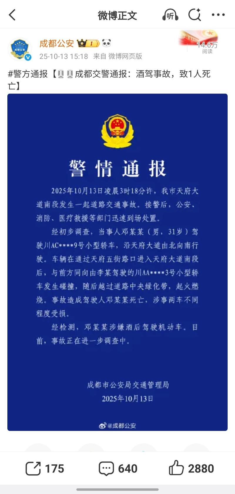大皖新闻讯 成都市公安局交通管理局10月13日发布警情通报:2025年10月13日凌晨3时18分许,成都市天府大道南段发生一起道路交通事故。接警后,公安、消防、医疗救援等部门迅速到场处置。经初步调查,当事人邓某某(男,31岁)驾驶川AC****9号小型轿车,沿天府大道由北向南行驶。车辆在通过天府五街路口进入天府大道南段后,与前方同向由李某驾驶的川AA****3号小型轿车发生碰撞,随后越过道路中央绿化带,起火燃烧。事故造成驾驶人邓某某死亡,涉事两车不同程度受损。经检测,邓某某涉嫌酒后驾驶机动车。目前,事故正在进一步调查中。
