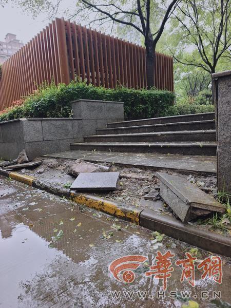 10月12日下午,华商报大风新闻记者在该广场看到,破裂的台阶位于广场西侧主通道,最下方的一级台阶已整个断裂,地砖散落在一边,露出下方的黄土和水泥,居民上下台阶只能从上一级台阶直接跨到地面,破损台阶周围没有任何防护措施。