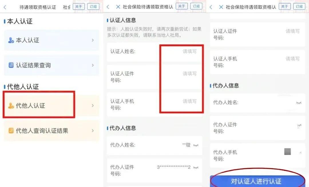 为他人认证的,选择“代他人认证”,添加人员信息后,核对代办人信息并选择“对认证人进行认证”,进行刷脸认证。(注意:点击“对认证人进行认证”后,代办人无需刷脸,对需要认证人进行人脸识别即可)。