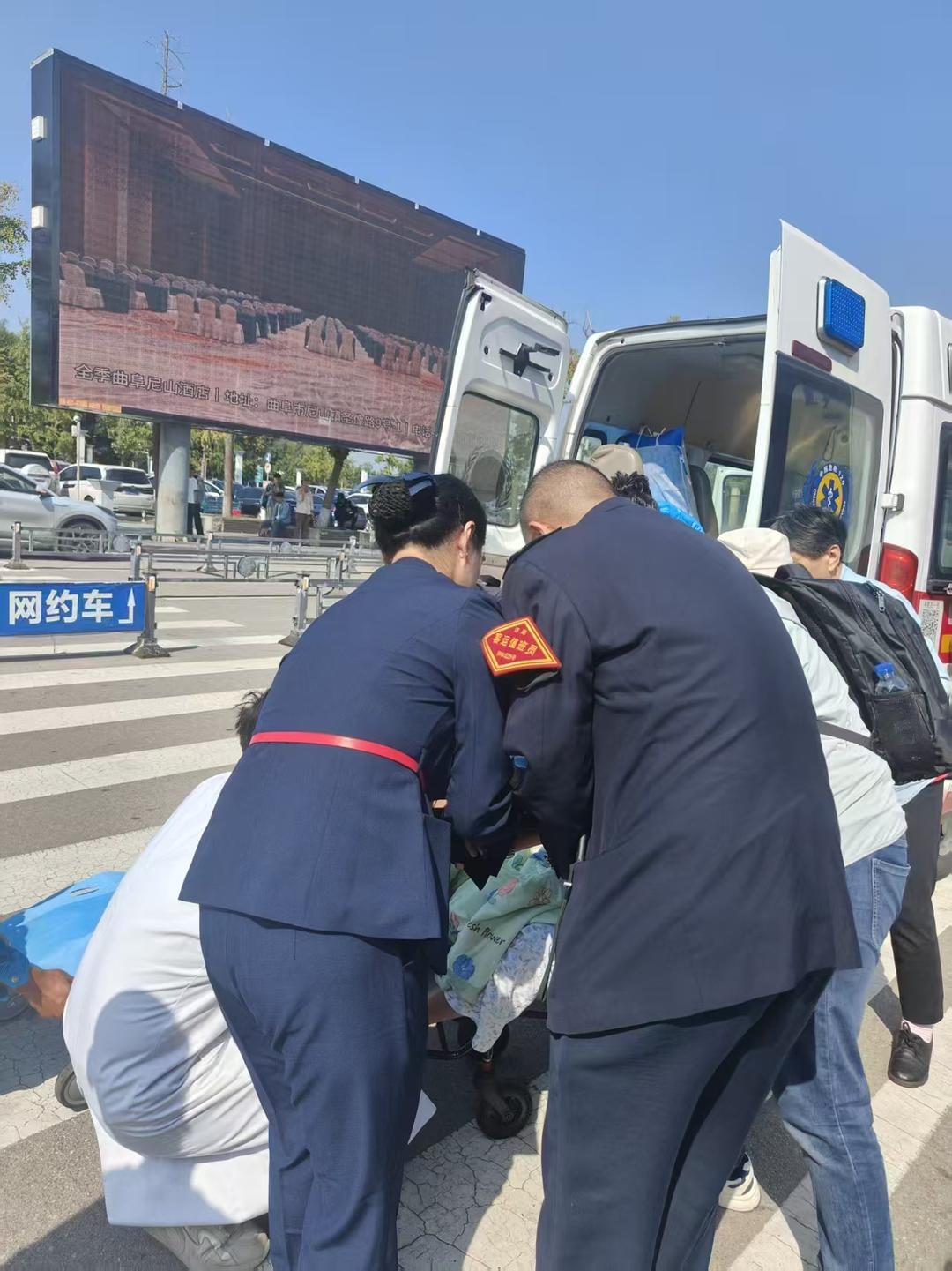 在护送的过程中,工作人员始终保持着高度的专注和耐心。他们不时关切地询问旅客的感受,当他们到达站外时,120救护车早已准备就绪,静静等候在那里。在工作人员的协助下,旅客顺利地从轮椅转移到了救护车上。分别之际,旅客紧紧握着工作人员的手,眼中满是感激,不停地表达着自己的谢意。
