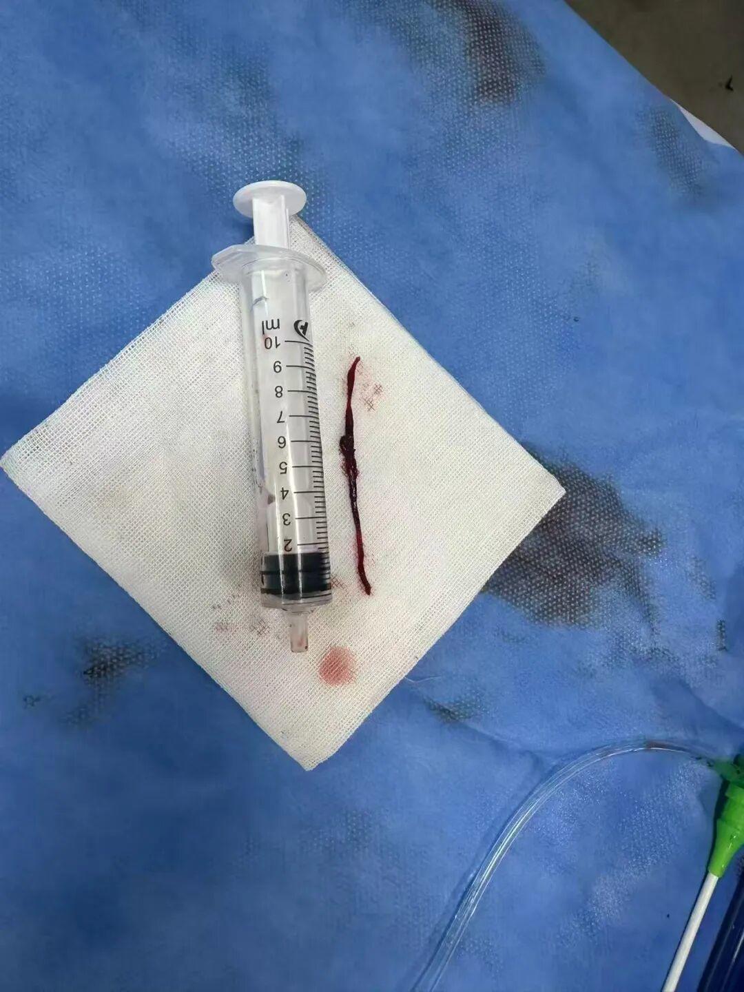 心脏冠脉造影显示:患者心脏RCA中段完全闭塞,情况十分危急。这让所有医护人员心头一紧。更为棘手的是,影像显示血管内潜伏着巨大的血栓团块。面对挑战,手术团队果断决策。小心翼翼地将导丝通过闭塞段后,启用血栓抽吸技术。从血管内吸出一条长达6厘米的暗红色完整血栓。如此巨大的血栓在临床上极为罕见,它不仅是导致本次心梗的“罪魁祸首”,更是极易脱落,引发更远段的血管栓塞,风险巨大。