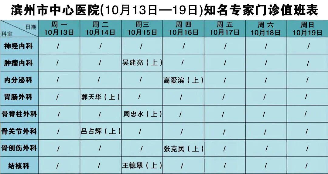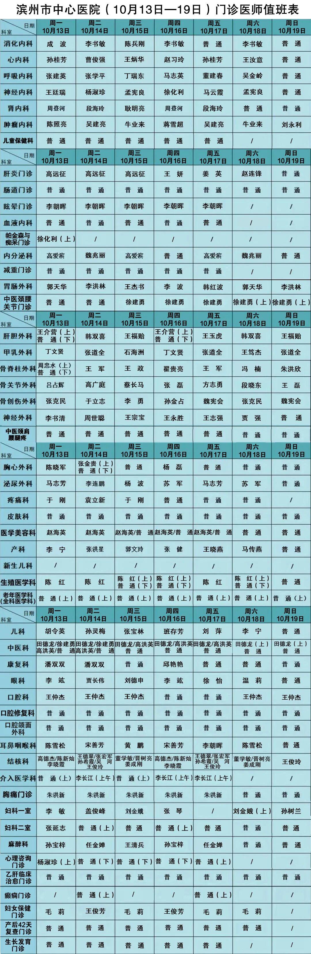 收藏丨滨州市中心医院10月13日—19日门诊医师值班表