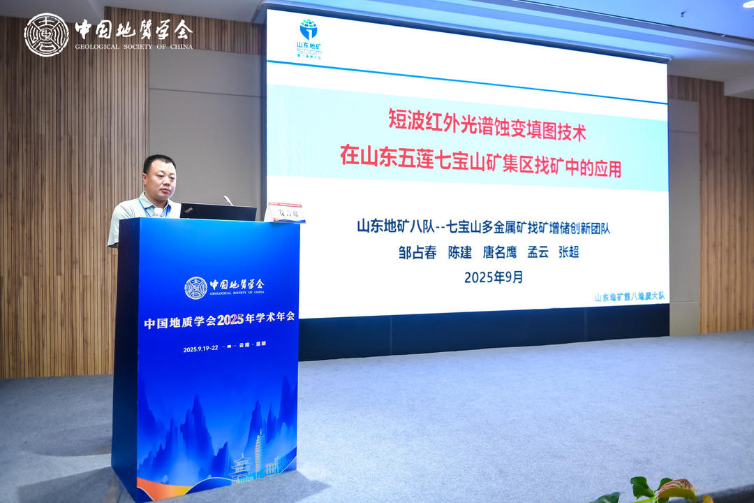 在“金及多金属成矿规律及找矿预测”分会场,八队邹占春以《短波红外光谱蚀变填图技术在山东五莲七宝山矿集区找矿中的应用》为题,系统汇报了项目成果。报告从区域地质背景、短波红外蚀变工作流程和成矿潜力分析三个方面,详细介绍了该技术的应用效果与实践经验。短波红外光谱技术通过快速、精准识别蚀变矿物,为隐伏矿体预测提供了重要依据,对深部找矿具有显著的指导意义,该项研究成果得到了与会专家的关注和肯定。