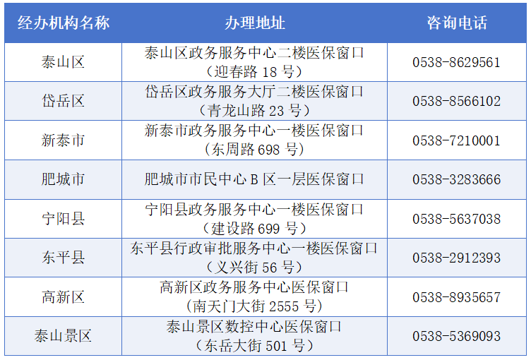 泰安市各县(市、区)居民征缴办理地址和咨询电话