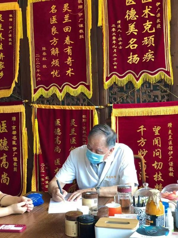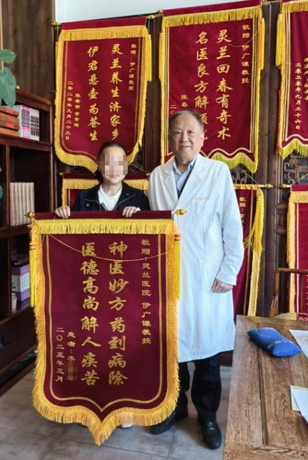近日,中国中医科学院主任医师伊广谦教授的诊室迎来了一位特殊的访客——康复患者李女士专程赶来,将一面书写着“神医妙方药到病除,医德高尚解人疾苦”的锦旗送到伊广谦手中。这面锦旗,为他那间早已被各式锦旗铺满的办公室再添了一道色彩,也再次印证了这位医者从事中医临床工作50余年所积淀的声望与仁心。