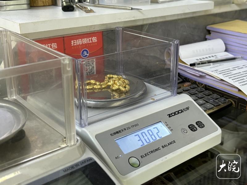 据江先生介绍,该店黄金的回收流程较为规范。一般先根据当天价格给客户报价,然后上秤称重,客户也可以在金店先行称重。称好之后,江先生会把黄金中的杂质和灰尘烧掉,再重新上秤,得到的克数乘以当天回收价,当场完成交易。“我们这个秤都跟计量局报备过,绝对准确。”江先生强调道。