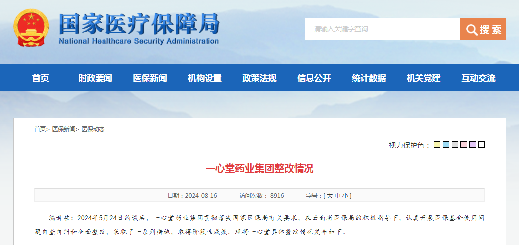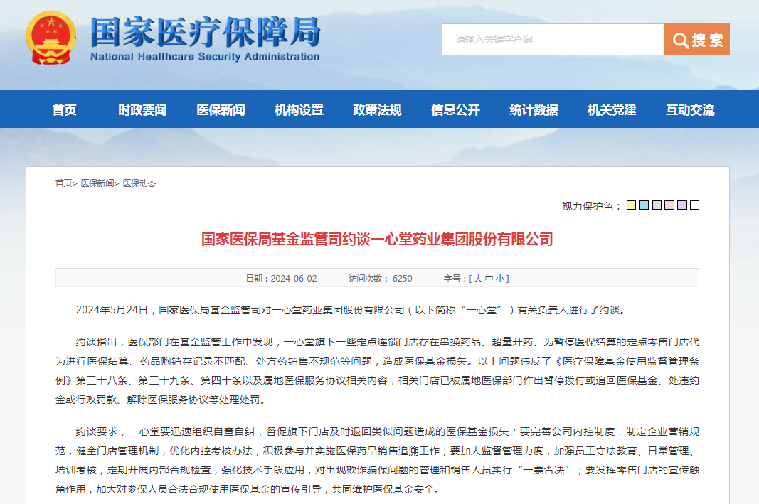 2024年5月24日,国家医保局基金监管司对一心堂有关负责人进行了约谈。约谈指出,医保部门在基金监管工作中发现,一心堂旗下一些定点连锁门店存在串换药品、超量开药、为暂停医保结算的定点零售门店代为进行医保结算、药品购销存记录不匹配、处方药销售不规范等问题,造成医保基金损失。