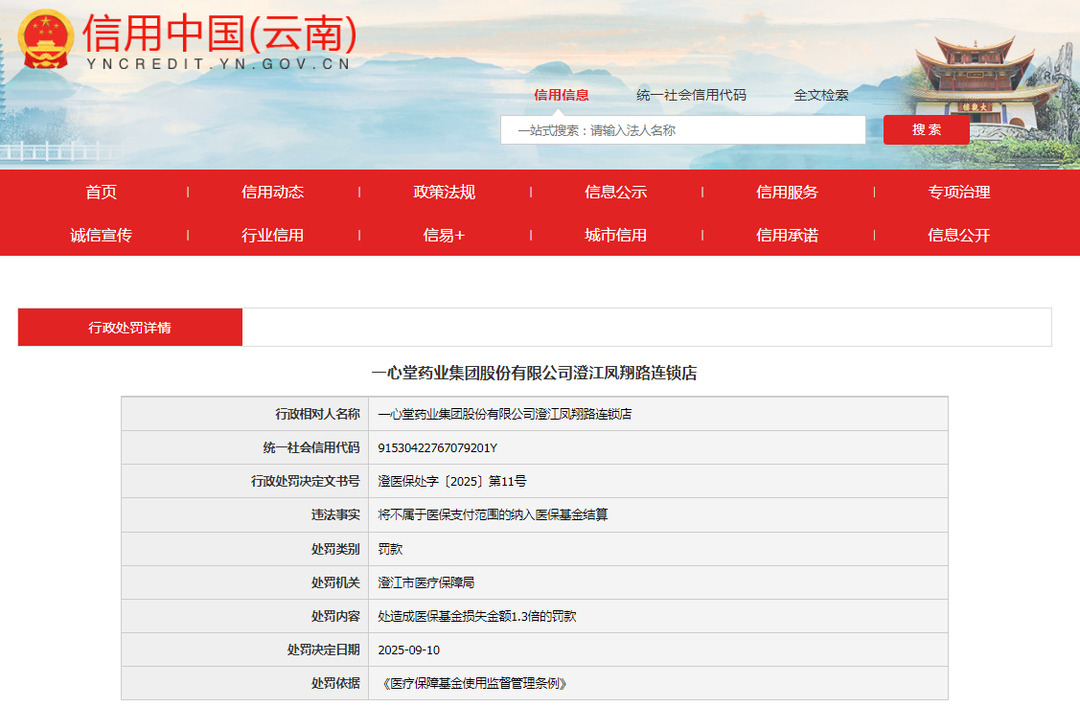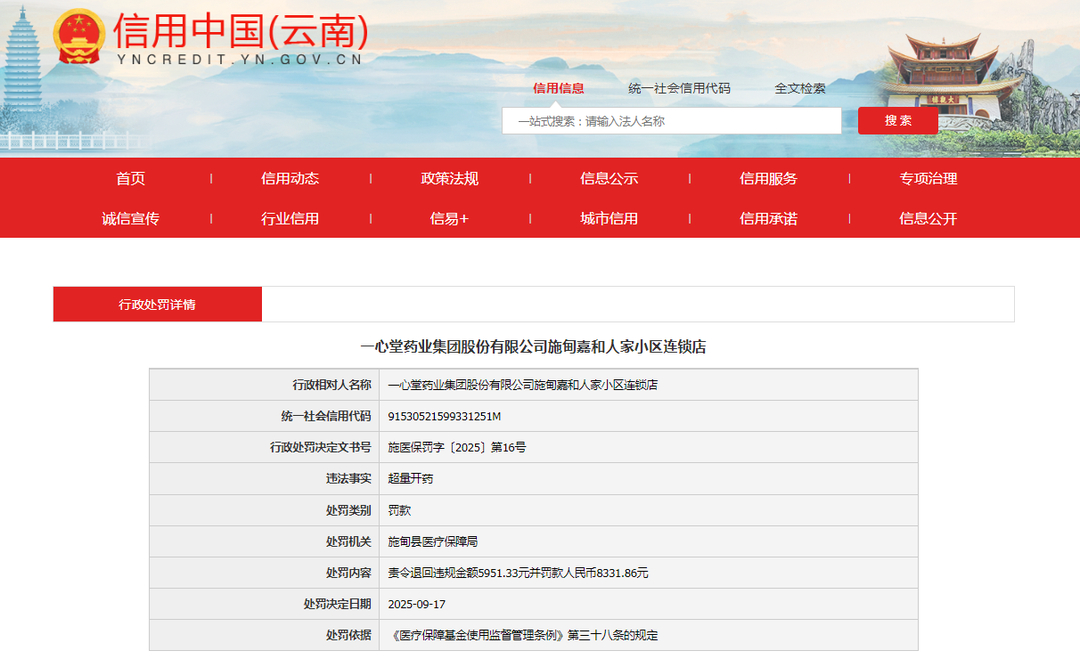 例如,信用中国(云南)9月17日公示的行政处罚详情显示,一心堂施甸嘉和人家小区连锁店因超量开药的违法事实,施甸县医疗保障局责令其退回违规金额5951.33元并罚款人民币8331.86元。