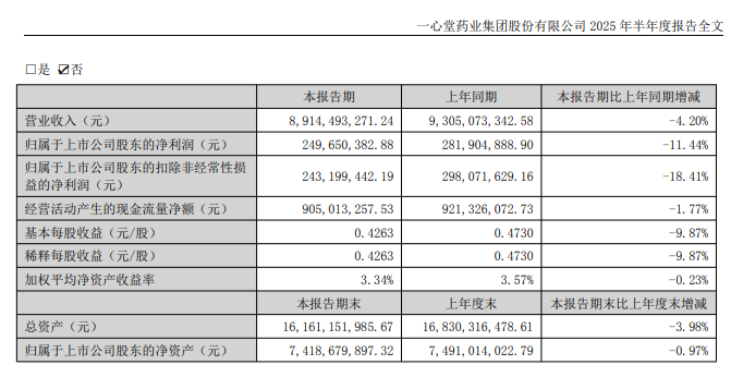 截至2025年6月末,一心堂门店总数为11372家,较年初净减少126家。营收方面,2025年上半年公司实现营业收入89.14亿元,同比下降4.20%;归母净利润为2.50亿元,同比下滑11.44%。