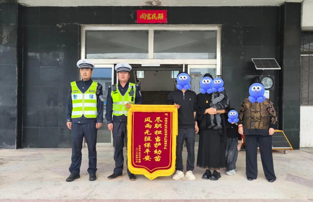 国庆期间,市民孔先生一家到西城中队送上一面了写有“尽职担当护幼苗,风雨无阻保平安”的锦旗,感谢西城中队民辅警紧急带路就医。