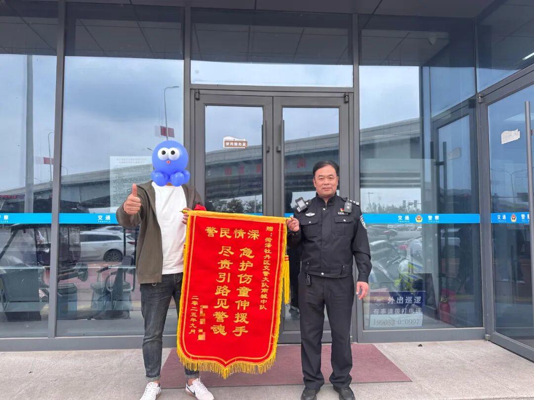 近日,钟先生到南城中队送上一面锦旗,上面写有“急护伤童伸援手,尽责引路见警魂”来表达对南城中队带路民辅警的感激。