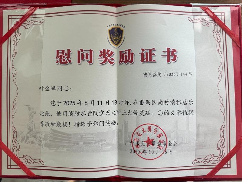 大皖新闻讯 8月12日,大皖新闻记者报道了广州番禺区居民叶金峰跪抱水枪隔空灭火一事,引起广泛关注。10月16日,大皖新闻记者从广州市见义勇为基金会获悉,鉴于叶金峰使用消防水管隔空灭火阻止火势蔓延的义举,该基金会特为其颁发了“慰问奖励证书”。对此,叶金峰表示,他深感荣幸。