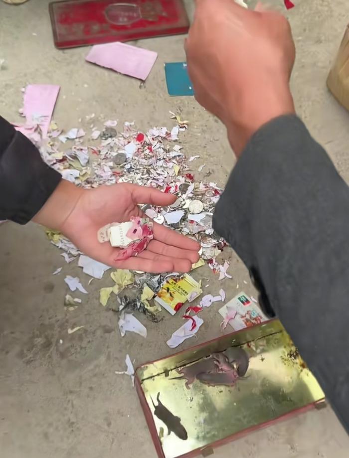 视频画面显示,存放这些财物的为一个红色铁盒,盒中有多只小老鼠,地上还有一堆存折和现金的碎片。视频发布后,引发热议,有人好奇为何铁盒中能钻进老鼠,还有人想知道这些现金碎片能否去银行兑换。