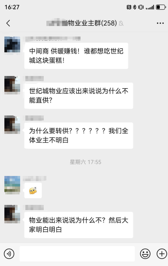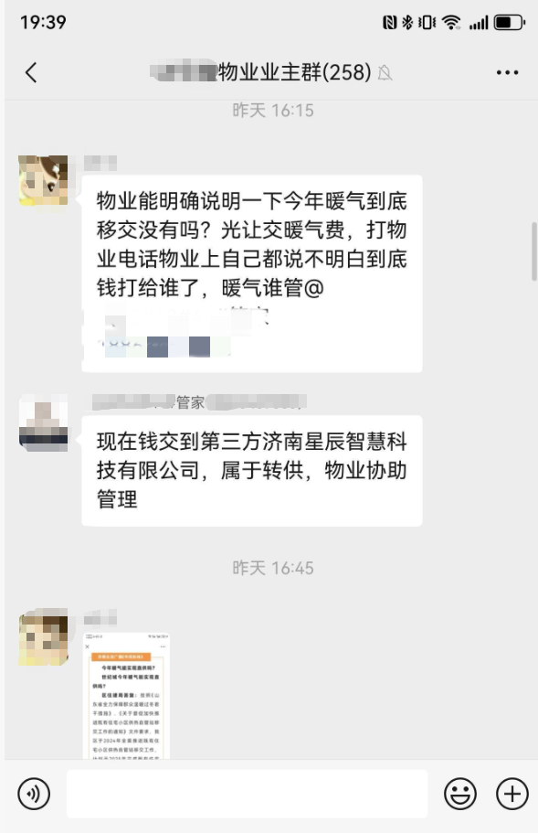 刘先生表示,2025年莱芜区全部小区将实现暖气直供,但是今年世纪城小区供暖方式依旧是物业代收,三方转供,这一做法让业主十分不解。业主在小区物业群寻求答案,但并没有得到物业工作人员的回复,物业的不作为和回避态度让居民感到无助和困惑。