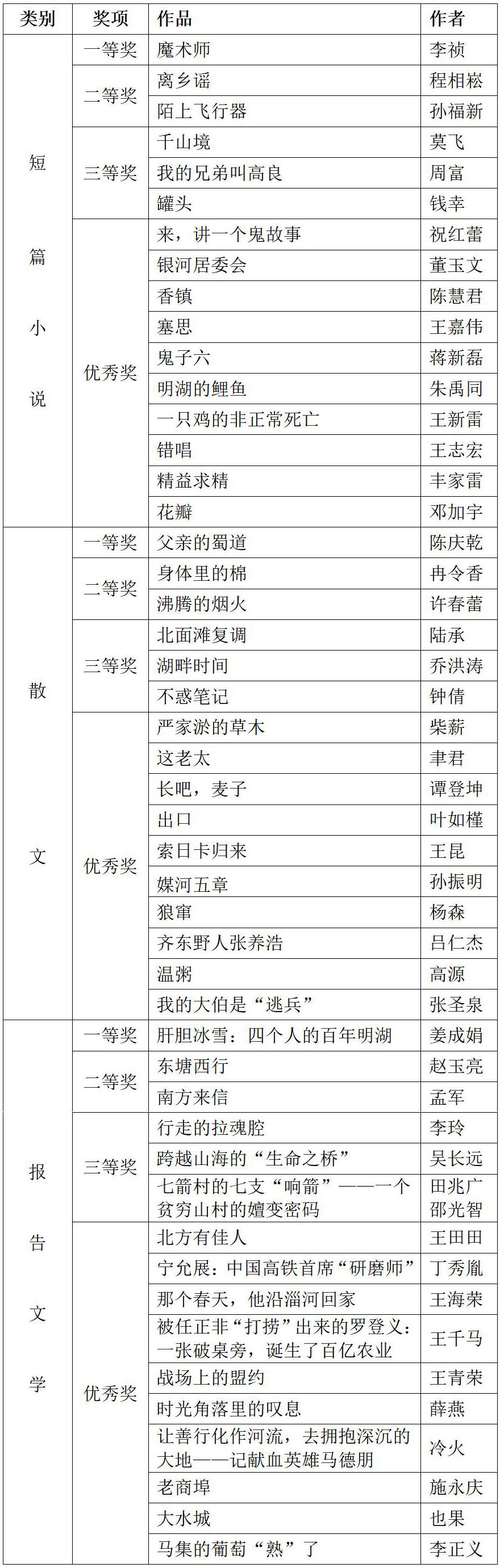 本次大赛设立短篇小说、散文、报告文学三大类别。经初评、复评、终评三轮评选,按照公平、公正、择优的原则,经过匿名定评和无记名投票,最终每个类别分别评出:一等奖1名,二等奖2名,三等奖3名,优秀奖10名,共计48名,现将名单予以公示。如公示名单中有不符合首届“青未了”文学创作大赛征稿要求的情况,请于公示期间向首届“青未了”文学创作大赛组委会如实反映并提供相关证据,反映情况需实名并提供联系方式。