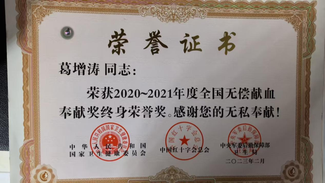 2008年汶川地震,他首次了解到血小板对于抢救生命的重要性,便毅然加入了机采成分血的队伍。25年来,他累计献血300余次,并加入了中华骨髓库,先后荣获全国无偿献血金奖和终身荣誉奖。
