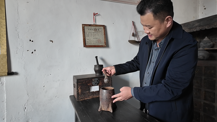 在赵帅家自建的中医文化馆中,赵家医术的传承就更加具象化了。从家传的清代民国时期中医药典籍到过去煎药用的器具,从老一辈用过的药碾子到1985年赵帅父亲获颁的“汶卫医字第005号”开业行医执照,无一不在讲述着这一家人的行医历史。“这些典籍也是我中医启蒙的起点,小时候经常翻阅,父亲也会讲给我,慢慢地就爱上了。”赵帅笑着说。