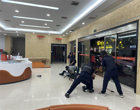 演练在该行营业部进行,演练背景为两名“歹徒”手持凶器闯入银行,企图对钱箱进行抢劫。面对突发情况,柜员临危不乱,沉着冷静按下110报警按钮,并迅速将现金、重要空白凭证等装箱上锁,躲在柜台隐蔽位置;大堂经理按照应急预案疏散大厅客户至安全区域;保安人员利用防护器械与“歹徒”进行周旋,拖延时间,等待警察到来,最终通过多方努力成功将“歹徒”制服。整个演练过程,银行员工与保安公司人员分工明确、配合默契,从报警、疏散、周旋到最后将“歹徒”制服,各个环节衔接紧密,行动果断迅速。