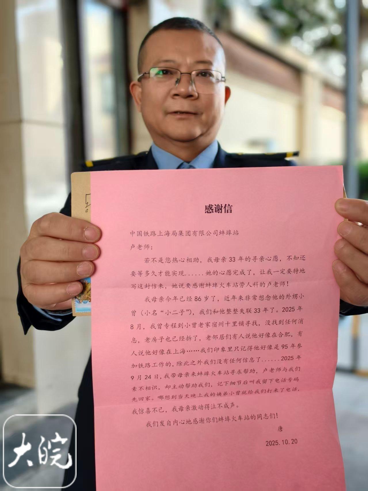 大皖新闻讯 10月23日午后,蚌埠火车站收发室的窗台上,多了封字迹工整的感谢信,信封上“卢老师收”四个字格外醒目,信内字里行间满是感激:“若不是您热心相助,我母亲33年的寻亲心愿,不知还要等多久才能实现……”这封来自唐女士的信,揭开了一段关于牵挂、奔波与重逢的温暖往事。