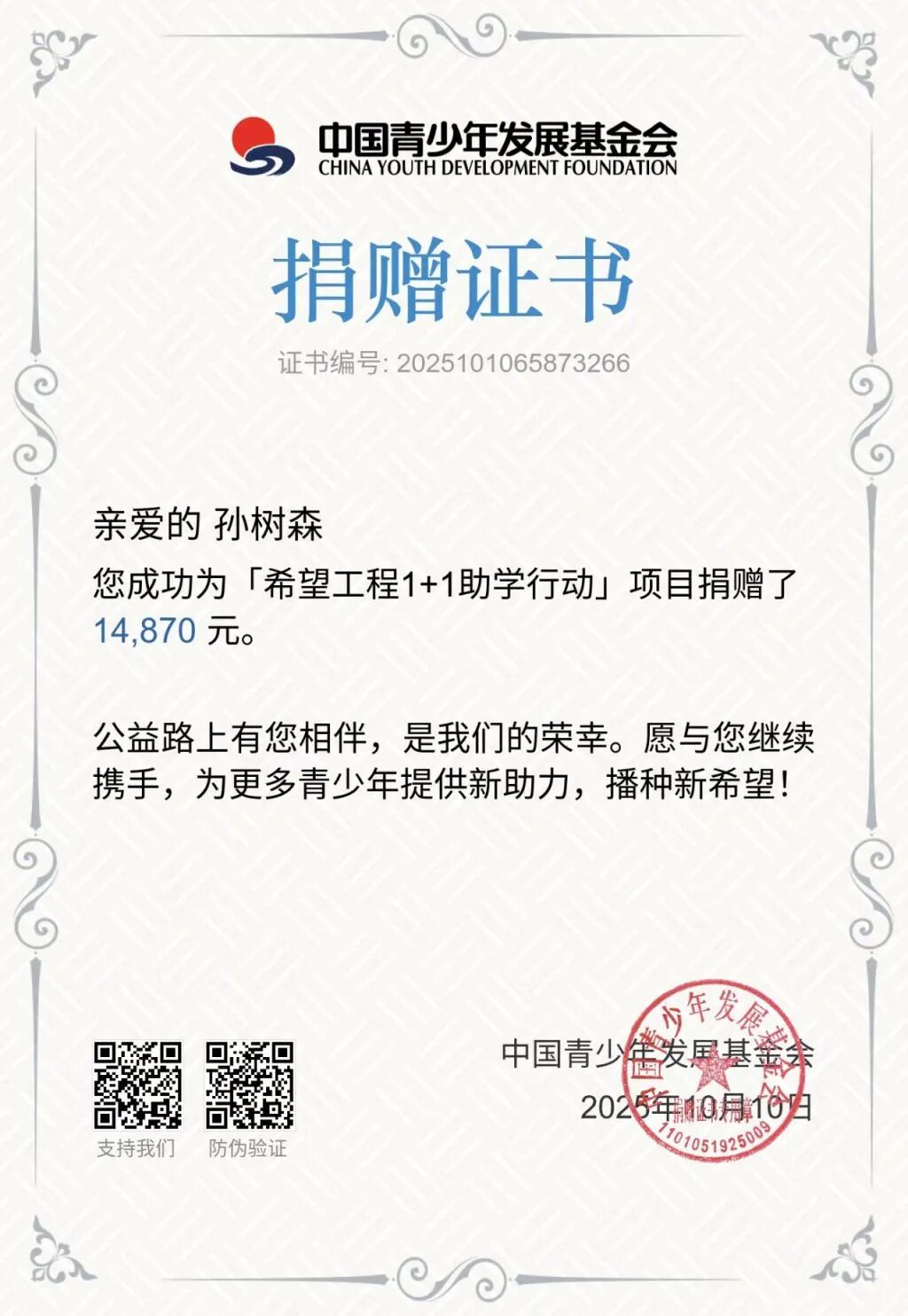10月中旬,孙树森将上述两起诉讼获得的赔偿款1.4万余元,捐赠给了中国青少年发展基金会“希望工程”。