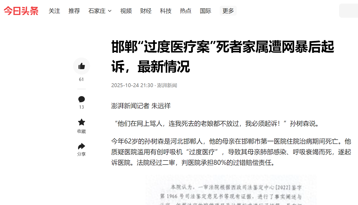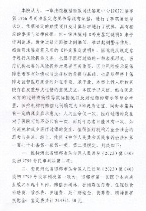 2023年12月,邯郸市中级法院作出二审判决,判邯郸市第一医院承担80%赔偿责任,赔偿死者家属26万余元。