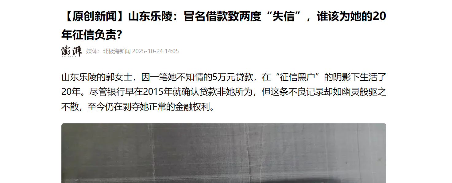 山东乐陵的郭女士,因一笔她不知情的5万元贷款,在“征信黑户”的阴影下生活了20年。尽管银行早在2015年就确认贷款非她所为,但这条不良记录却如幽灵般驱之不散,至今仍在剥夺她正常的金融权利。