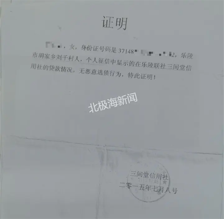 图为2015年三间堂信用社为郭女士办理房贷出具的证明材料