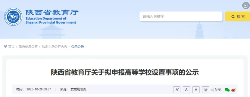 华商网讯 10月27日,陕西省教育厅发布陕西省教育厅关于拟申报高等学校设置事项的公示,具体内容如下。