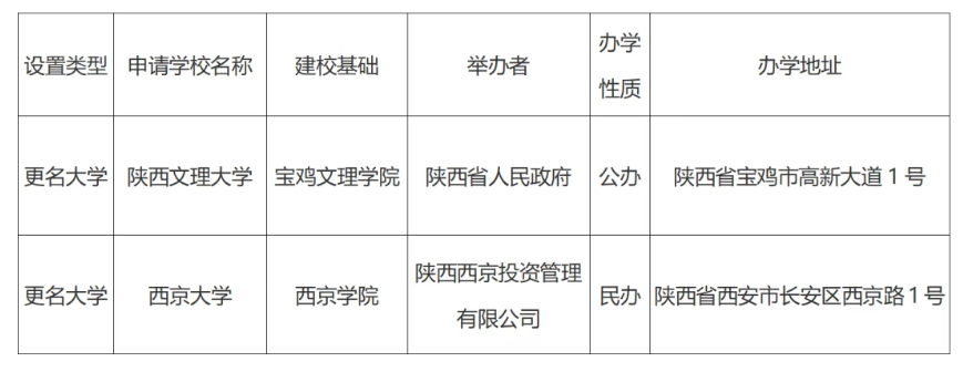 根据《中华人民共和国高等教育法》《普通高等学校设置暂行条例》《普通本科学校设置暂行规定》等有关规定,经陕西省高等学校设置评议委员会考察和评议,现对拟向教育部申报的“宝鸡文理学院更名陕西文理大学”“西京学院更名西京大学”事项予以公示,接受社会监督。