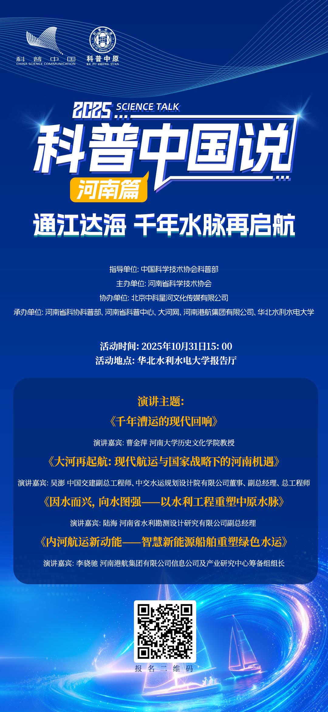 备受期待的“科普中国说·河南篇”第四期——“通江达海 千年水脉再起航”主题科普活动,将于10月31日下午3时在华北水利水电大学报告厅重磅开启。