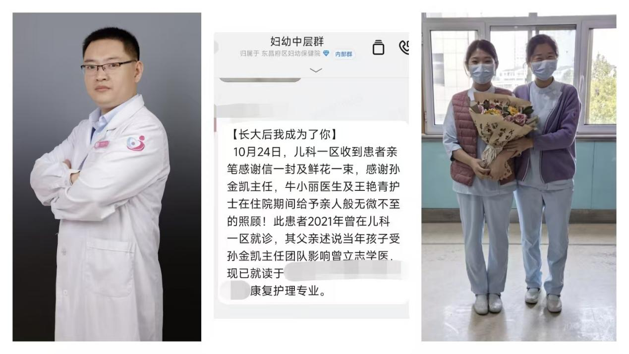 2021年9月份,12岁的小张因大叶性肺炎入院治疗,时任儿科一区主任的孙金凯和团队同事们第一时间接诊。看着小张因呼吸困难而涨红的小脸,孙金凯和同事们以最快的速度为小张量身定制了详细的治疗方案。住院的13天里,小张先后做了四次气管镜,出院后,又多次到孙金凯所在门诊进行复诊。这期间,孙金凯等医护人员的细致耐心,给小小的她留下了深刻的印象,也在不经意间埋下了一颗种子。