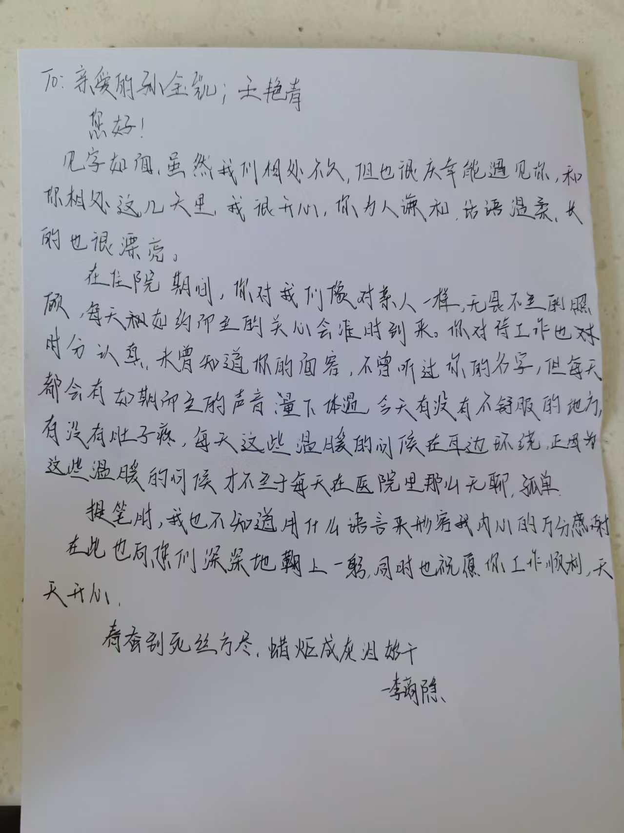 小张在信里感谢了孙金凯和本次住院后细心照顾她的护士王艳青,并为王艳青送上一束鲜花。感谢信上的字迹一笔一划满是真诚,字里行间都是对该院医护人员跨越四年、两次施救的铭记与感恩。