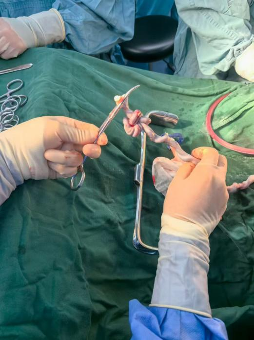 手术顺利进行,新生儿出生后活力良好。直到胎盘娩出,真正的“元凶”才浮出水面——脐带上赫然打着两个方向相反、紧紧缠绕的真结。周曙光称,脐带真结发生率仅约1%,而“双真结”更为罕见。“它们会像打结的水管一样,机械压迫血管,导致胎儿供血供氧中断,是造成胎儿窘迫甚至死亡的高危因素。”