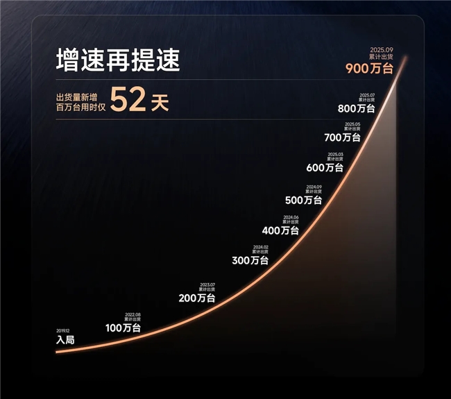 电动两轮车业务是其最核心的增长引擎。 第三季度,该业务板块销售量高达148.67万台,实现营收44.54亿元,同比增长约72%。尤为引人注目的是,九号电动两轮车在中国市场的累计出货量已成功突破900万台。其中,从800万台到900万台的销量增长仅耗时52天,再度刷新了行业增长纪录,彰显了惊人的市场扩张速度。