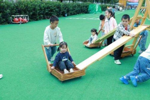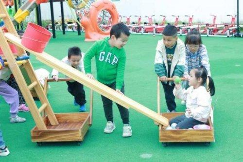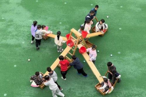 当一切准备就绪,“旋转木马 3.0 版本” 惊艳亮相!孩子们坐在小推车上,随着旋转伸手接中间投来的海洋球,没投进的球落在地上,“砰砰砰” 的响声成了快乐的伴奏。他们再次邀请小班弟弟妹妹体验,“要抓紧哦!”“看,球来啦!” 笑声、欢呼声在操场上久久回荡。此刻,梯架不再是简单的运动器械,而是孩子们用想象与双手创造的 “快乐星球”,幼儿园的 “魔法游乐场” 也有了第一个正式 “项目”。