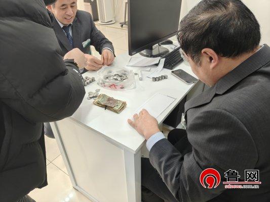 网点主任于孔走过来,看到女士为难的神情,立刻露出温和的笑容:“你好,别着急,我们立刻帮您清点。”说着,他随即坐下来开始为刘女士清点硬币,内勤行长窦冰洁和大堂经理赵成涛见状也连忙加入其中。