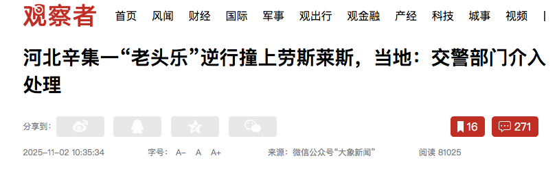 据观察者网,10月31日,有网友爆料河北石家庄辛集市一老年代步车逆行撞上劳斯莱斯,事故造成劳斯莱斯损毁严重。