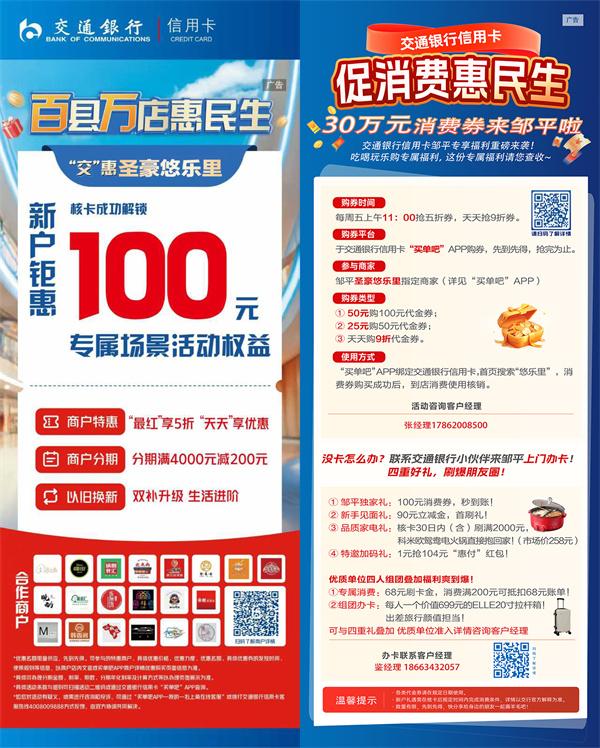 鲁网11月4日讯交通银行信用卡“促消费惠民生”福利重磅来袭——30万元消费券已登陆邹平圣豪悠乐里。