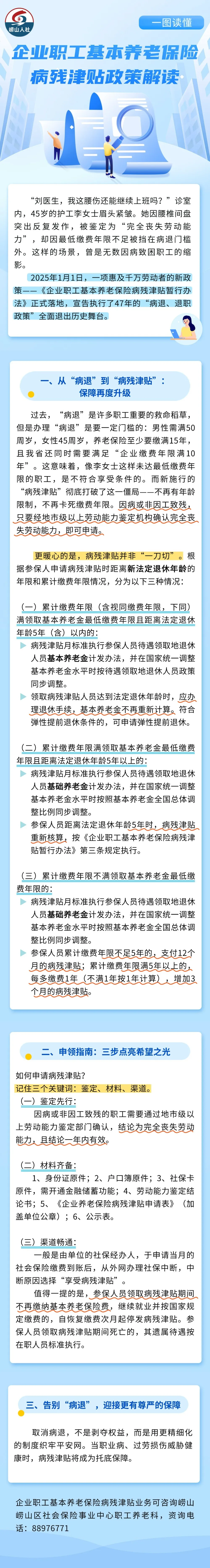 鲁网11月10日讯青岛市崂山区人力资源和社会保障局推出“周周讲”与“月月答”栏目,围绕就业创业、社会保障、人事人才、劳动关系类各项政策法规,以“权威解读、精准服务、互动交流”为宗旨,聚焦群众和企业关切的人社热点、难点问题,采用通俗易懂的宣传形式为大家解疑释惑。本期解读:企业职工基本养老保险病残津贴政策。(本网记者)