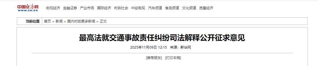 新华社北京11月9日电(记者冯家顺)最高人民法院11月9日公布关于审理交通事故责任纠纷案件适用法律若干问题的解释(二)(征求意见稿),向社会公开征求意见。该司法解释拟就“开门杀”、电动自行车与机动车发生交通事故造成机动车一方人身损害等问题作出规定,征求意见截止日期为11月15日。