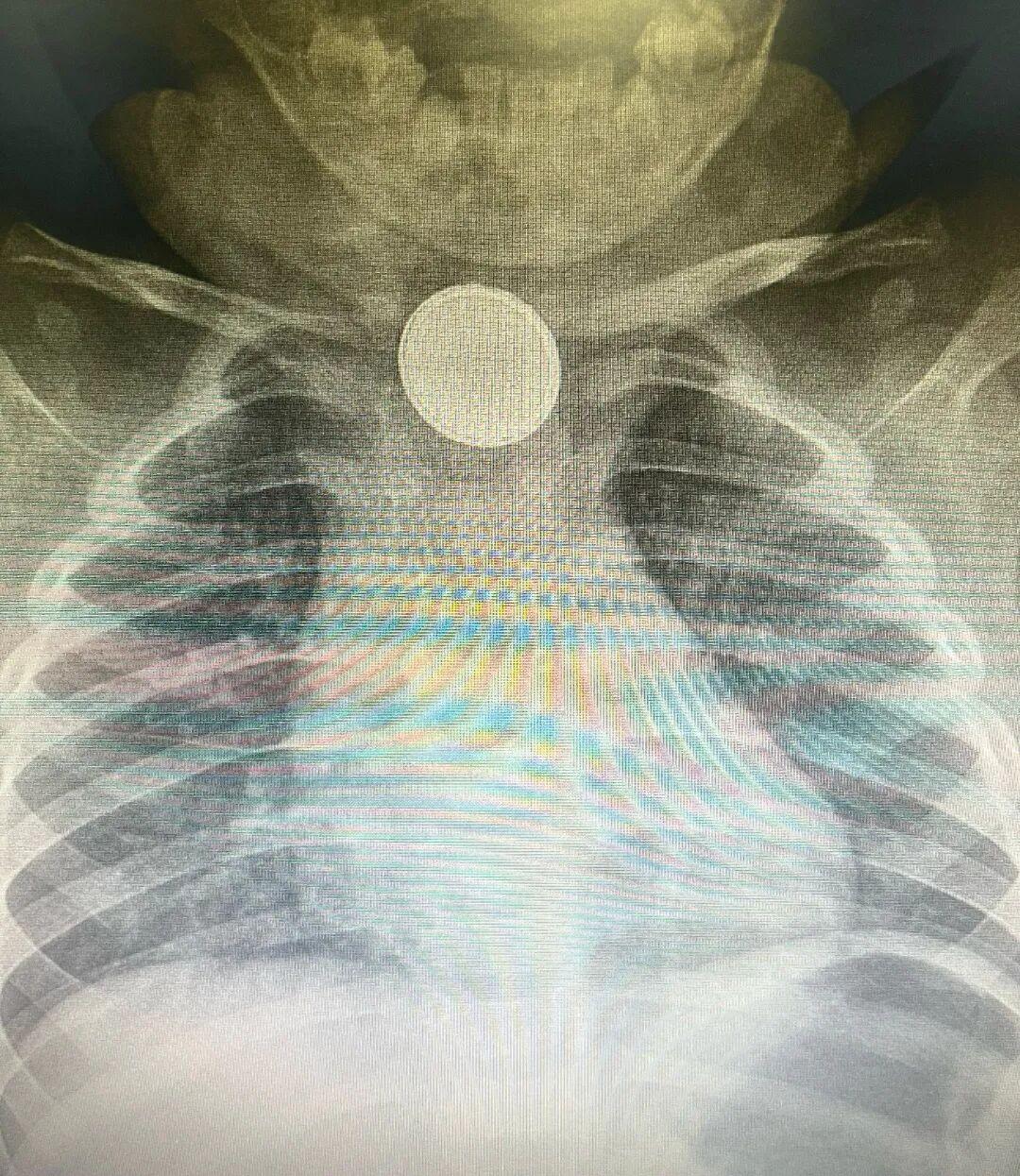 急诊医师凭借丰富经验,初步判断是消化道异物,当即安排检查。X线片很快给出答案——食管处可见出现一个类圆形高密度影。