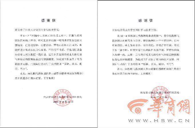 近日,西安电子科技大学空间科学与技术学院程鹏飞教授团队接连收到来自应急管理部上海消防研究所科技处的两封感谢信,信中对该团队在“12·4深圳深江铁路坍塌事故”和“8·7兰州榆中山洪泥石流”两次重大灾害救援中的突出贡献表示高度肯定与诚挚感谢。